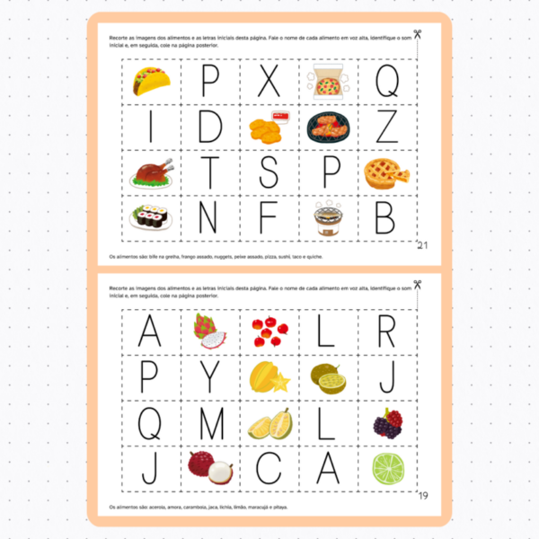 A criança observa as imagens, nomeia cada alimentos em voz alta, identifica o som inicial da palavra e seleciona a letra correspondente. Em seguida, realiza a colagem da imagem e da letra no espaço indicado, consolidando a associação entre som e representação gráfica de forma concreta e significativa.