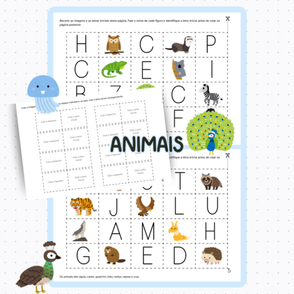 A criança observa as imagens, nomeia cada elemento em voz alta, identifica o som inicial da palavra e seleciona a letra correspondente. Em seguida, realiza a colagem da imagem e da letra no espaço indicado, consolidando a associação entre som e representação gráfica de forma concreta e significativa.